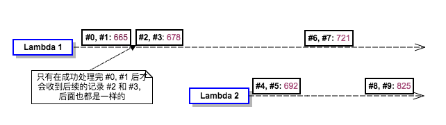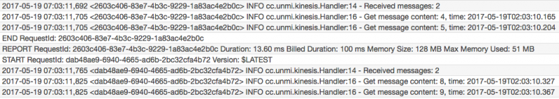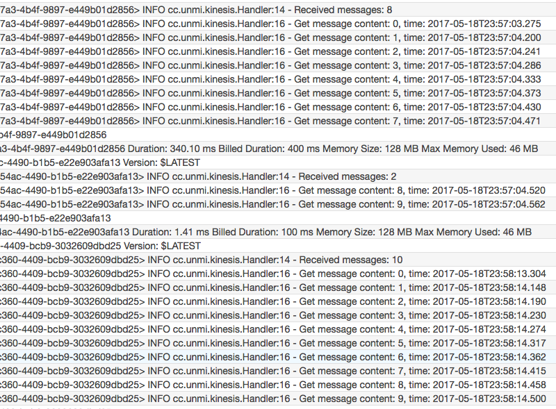 因测试要求,把日志时间精度调到了微秒,由于上面两个 Lambda 实例都是从同一个 Kinesis Shard 上获取的消息,所以它们是有依赖顺序的,Lambda 1 在消费完 #0, #1, #2, #3, 然后是 Lambda 2 收到并消费完 #4, #5,接着又 Lambda 1 消费 #6, #7, 最后才是 Lambda 2 收到 #8, #9。