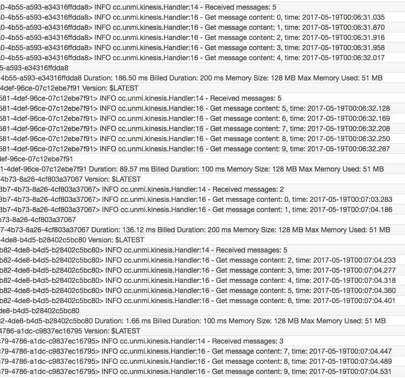 }测试环境: Kinesis stream 分配了 2 个 Shards, 每次都运行上面的代码始终向同一个 Shard 发送十条消息试验一:Lambda 能正常处理每一条 Kinesis 消息,Trigger batchSize: 10, 执行上面代码两次向同一个 Shard 发送了 20 条消息