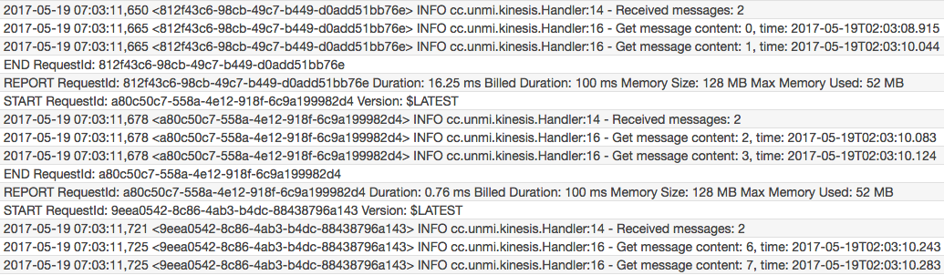 因测试要求,把日志时间精度调到了微秒,由于上面两个 Lambda 实例都是从同一个 Kinesis Shard 上获取的消息,所以它们是有依赖顺序的,Lambda 1 在消费完 #0, #1, #2, #3, 然后是 Lambda 2 收到并消费完 #4, #5,接着又 Lambda 1 消费 #6, #7, 最后才是 Lambda 2 收到 #8, #9。
