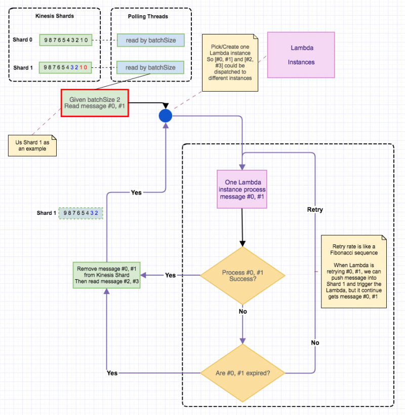 2016-08-24: Kinesis 的的实现就是 Kafka, 所以 Shard 就是 Kafka 的 Partition。一个 Kinesis 能触发的 Lambda 实例就相当于一个 Kafka Topic 的同 GOUPD ID 的 Consumer, 因此最多只需要启动与 Shard 数目一样的 Lambda 实例,多了也没用。每个 Lambda 实例每次只从同一个 Shard 取若干条(Trigger batchSize 决定的) 消息记录, 完全消费成功这些记录才能提交消息的 Offset(Kafka 中的概念, Kinesi 中叫做 MessageId), 否则不断的重试。
