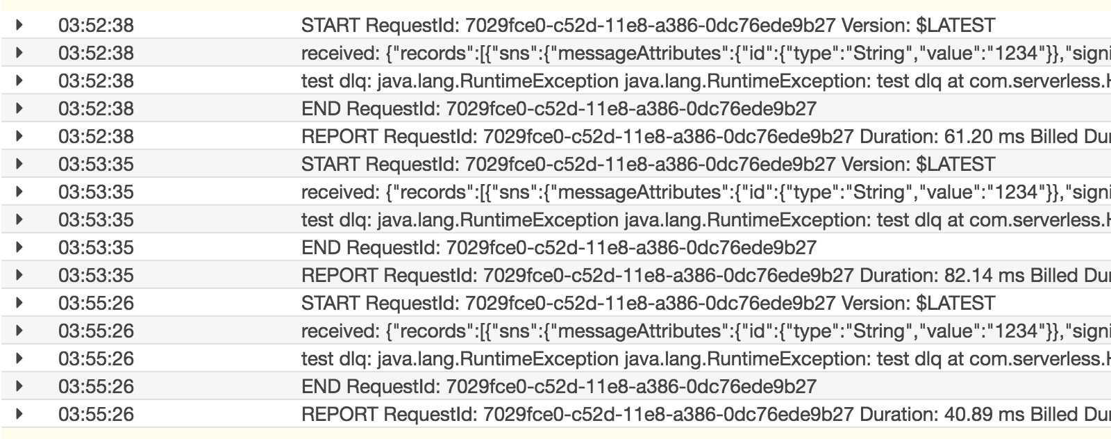 7029fce0-c52d-11e8-a386-0dc76ede9b27。 - 最多执行三次(针对 SNS 消息),最后把错误相关的信息送到所设定的 DLQ 中去