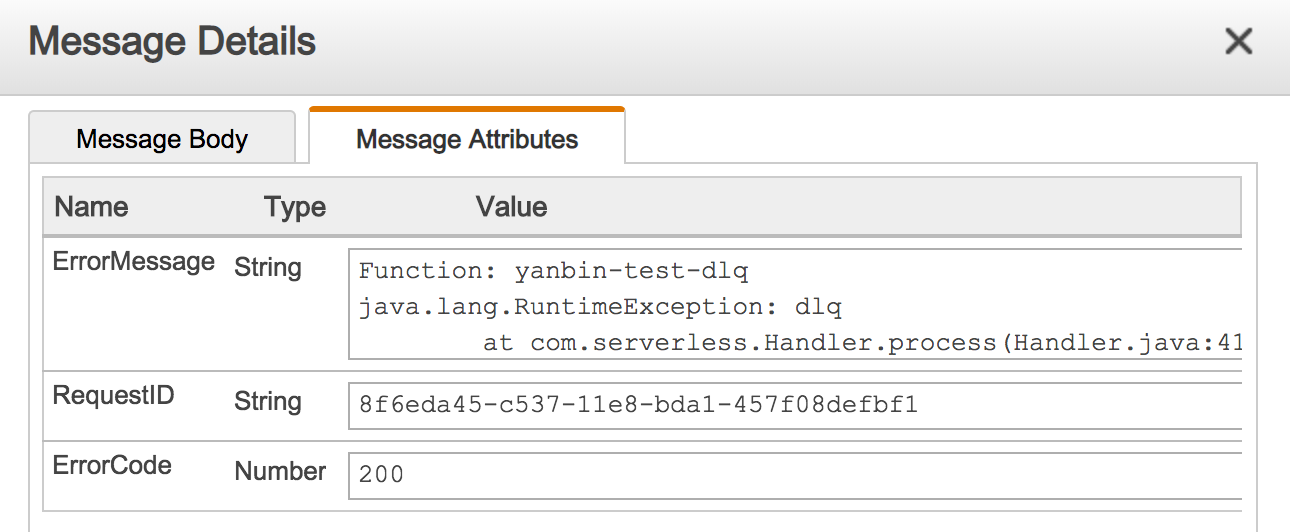 messageAttributes中,键为ErrorCode。不知如何设置不同的 ErrorCode。 - ErrorMessage, 即原 Lambda 抛出 Exception 的 getMessage() 信息,截取 1 KB 字符串,也是放在新 SNS 消息的
